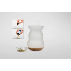 O copo de vidro (feito de areia de sílica e 40% de vidro branco reciclado) é soprado à boca, e a câmara interior do perfume é também feita à mão com vidro de borosilicato resistente ao calor, com uma flor da vida impressa na parte inferior. A base de madeira é feita de F.S.C. cinzas certificadas.